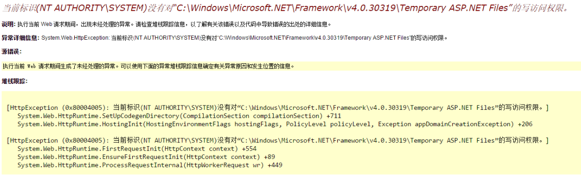 异常详细信息: System.Web.HttpException: 当前标识(NT AUTHORITY\NETWORK SERVICE)没有对“C:\WINDOWS\Microsoft.NET\Framework\v4.0.30319\Temporary ASP.NET Files”的写访问权限