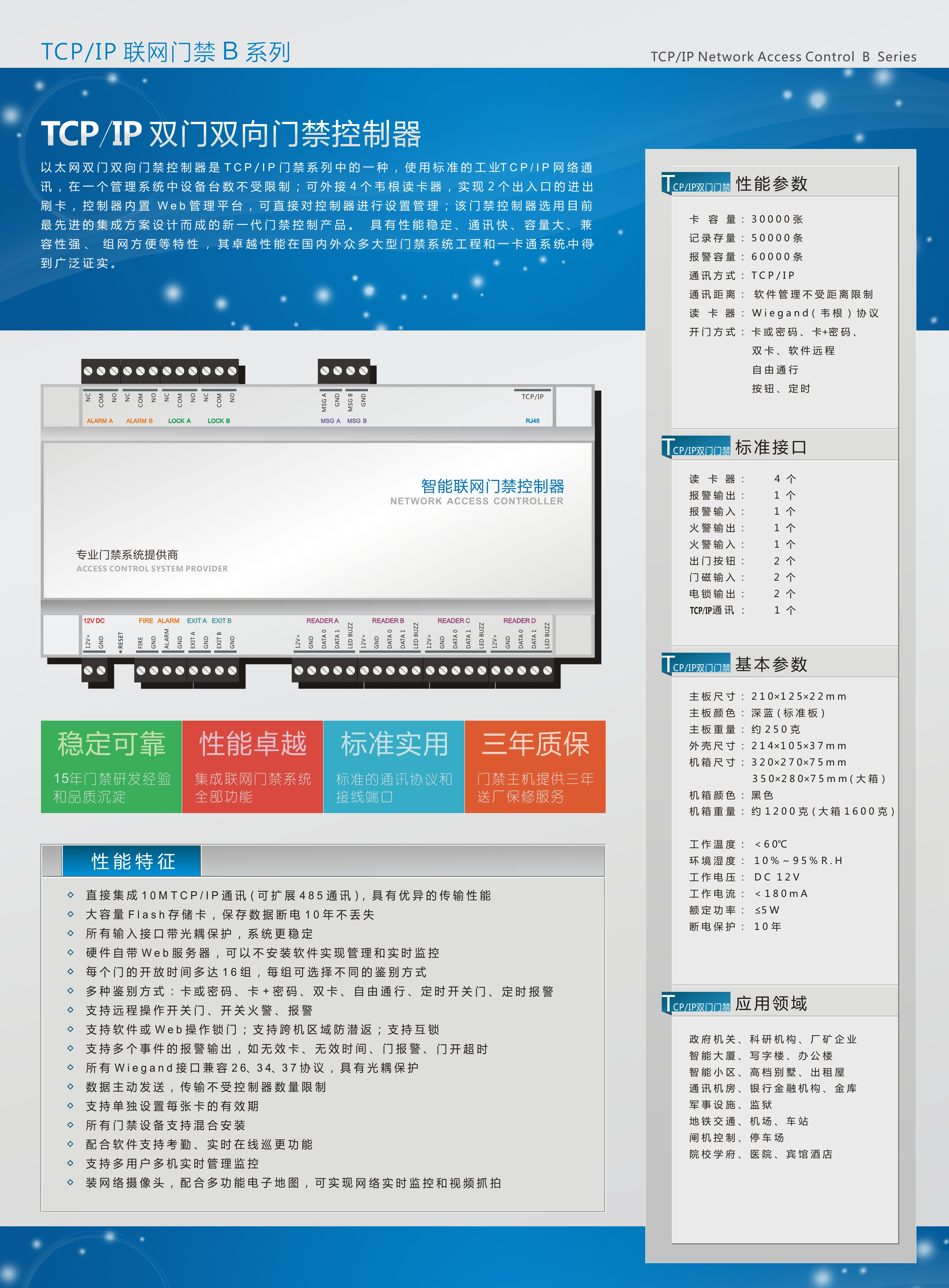 以太网双门双向门禁控制器是TCP/IP门禁系列中的一种;可外接4个韦根读卡器,实现2个出入口的进出刷卡,控制器内置Web管理平台,可直接对控制器进行设置管理。