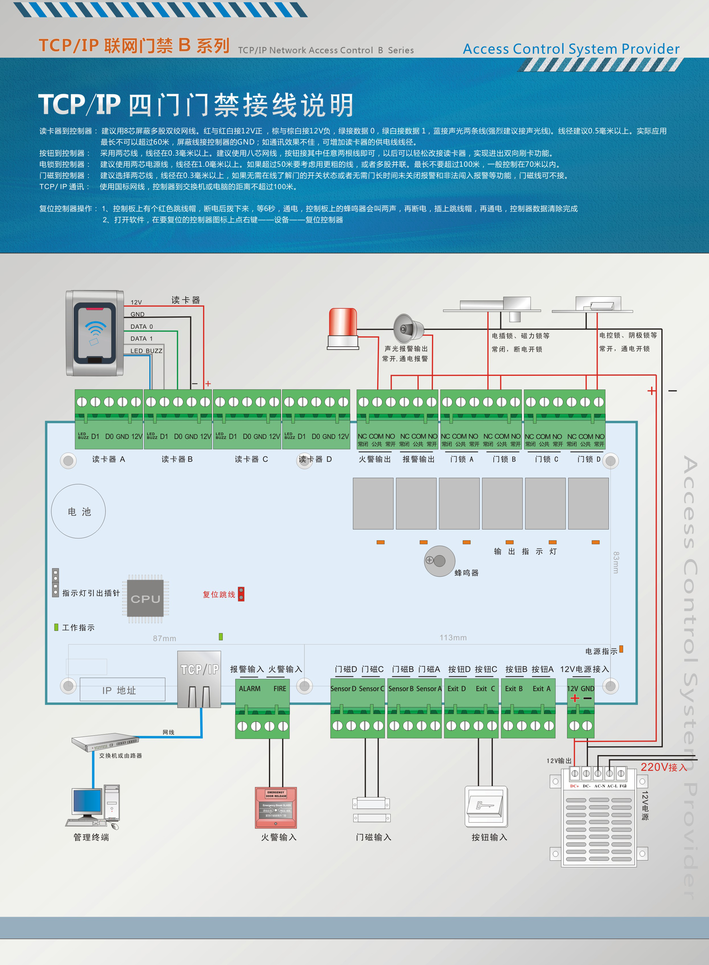 - 支持多个事件的报警输出,如无效卡、无效时间、门报警、门开超时